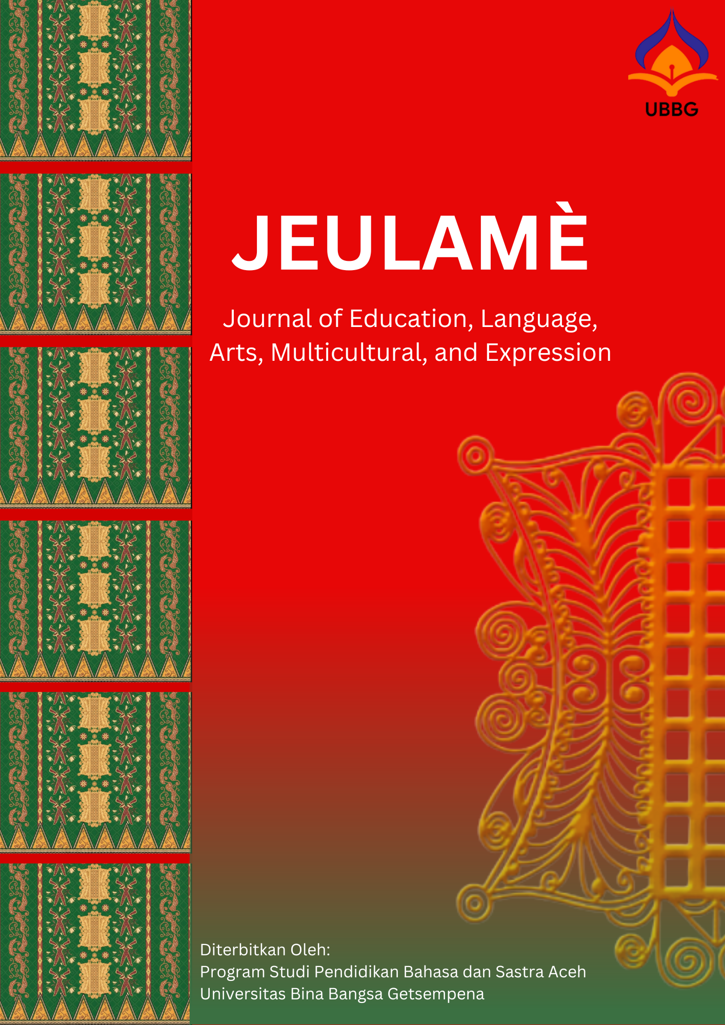 JEULAMÈ (Journal of Education, Language, Arts, Multicultural, and Expression) is an open-access, peer-reviewed scientific journal that publishes scholarly works related to education, linguistics, literature, arts, cultural studies, and multicultural expression from local, national, and global perspectives. The journal is published twice a year, in February and August. While the journal welcomes research in various contexts and languages, JEULAME places particular emphasis on studies related to the Acehnese language, Acehnese literature, cultural heritage, and local knowledge as part of efforts to preserve, revitalize, and disseminate Aceh’s cultural and linguistic richness in the global academic arena. The journal aims to facilitate interdisciplinary academic dialogue, encourage innovation in educational practice, preserve cultural identity, and support the dissemination of original research that contributes to the development of knowledge and scientific discourse.